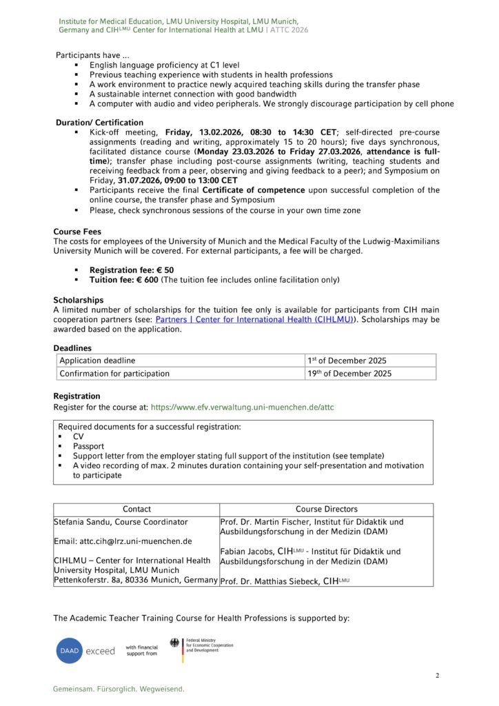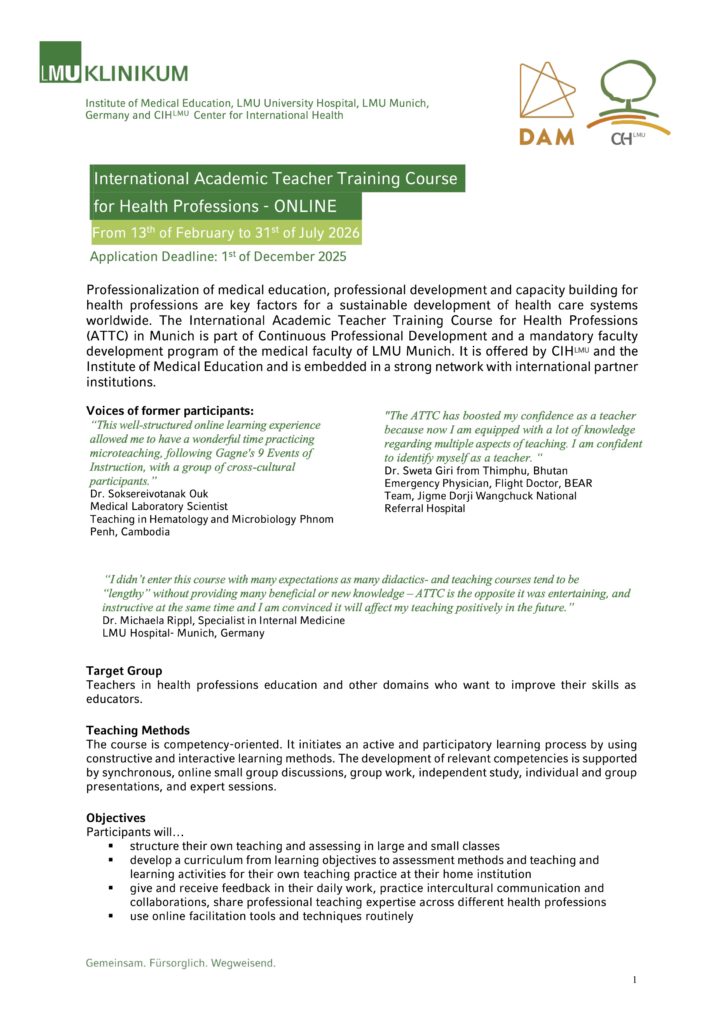 The final selection of candidates shall be carried out by the Centre for Innovation in Health (CIH) and the Institute of Medical Education (IME), Munich Germany.